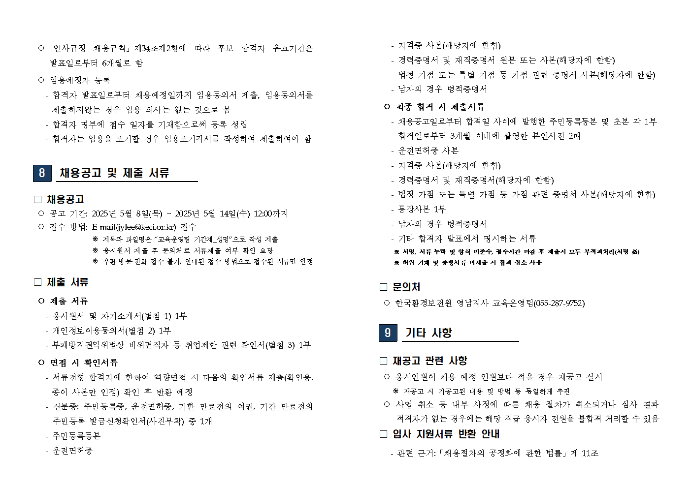 한국환경보전원 낙동강수변생태관리단 기간제(육아휴직 대체) 직원 채용 최종합격자 발표