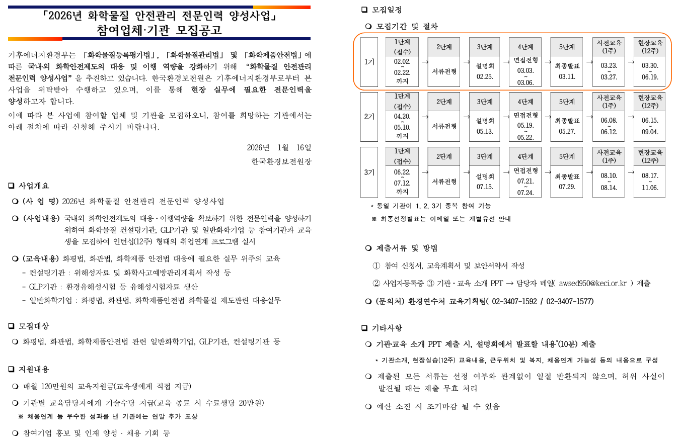 「화학물질 안전관리 전문인력 양성사업」 1기 교육생 모집공고